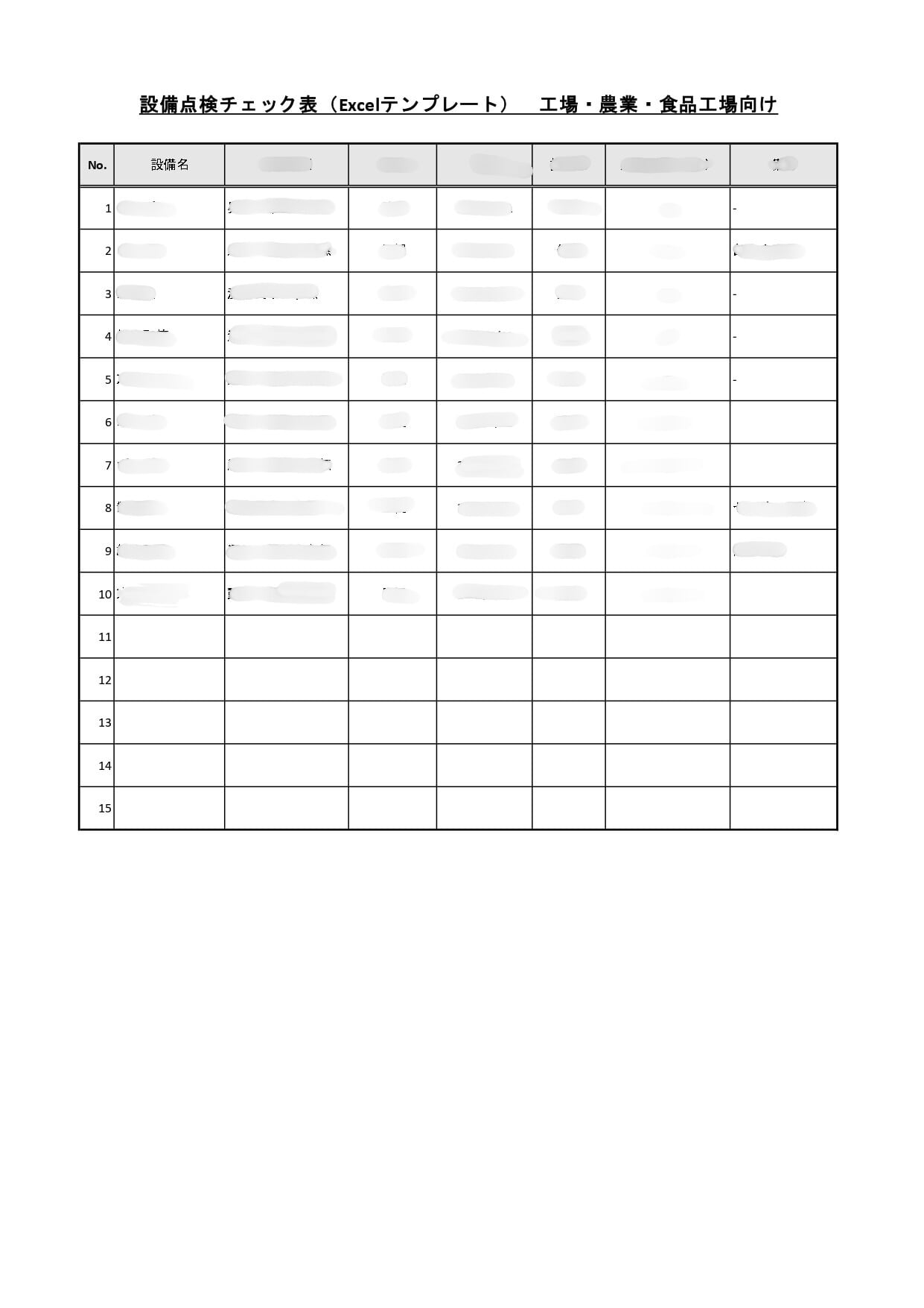 工場や農業施設、食品工場などで使える設備点検チェック表(Excel形式)です。